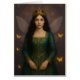 This enchanting artwork features a fairy princess in a emerald green gown adorned with golden embroidery, set against a deep violet background with floral motifs. Her serene gaze and shimmering iridescent wings evoke a sense of regal grace and timeless fantasy. Perfect for lovers of fairy tales, fantasy art, and magical elegance. This artwork was generated by AI based on original human concepts.