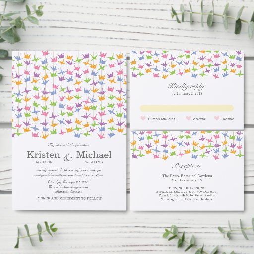 Diese Hochzeitseinladung enthält Streicher aus pastellfarbenen hübschen Origami-Papierkran, die sich perfekt für asiatische Themenfeiern eignen. Dies ist ein Hinweis auf die uralte japanische Legende, 1.000 Krane für tausend Jahre Glück und Wohlstand zu falten. Die Farben können auf den Anzug des Motivs Ihrer Hochzeit angepasst werden.