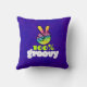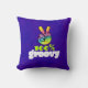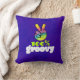 Ein trendiges cooles Kissen mit Typografie-Design, das ein Regenbogenfriedzeichen mit in einem V aufgehobenen Fingern enthält. Text sagt 100% Groovy in einem funky Schriftart. Psychedelisches Hippie Design. Set auf einem dunkelfarbigen, sauren lila Hintergrund.