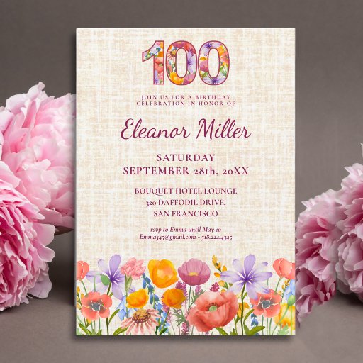 Celebrate her 100th in style with this wildflower invitation featuring a large floral-filled “100”, a soft linen-look background and watercolor garden flowers along the bottom. Personalize the name, party details and RSVP to create a beautiful keepsake for an elegant milestone birthday celebration. Enjoy!