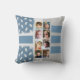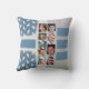16 Foto doppelseitige Collage werfen Kissen / Kissen hinzufügen 8 Fotos auf der Vorderseite und weitere 8 auf der Rückseite. Grau und blau mit Blätter und Streifen.