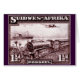 1937 Südwestafrika 1 1/2 d Briefmarke mit Eisenbahn, Dampfschiff und Flugzeug - alle Transportarten, die für die Zustellung von Postsendungen in diese Region Afrikas verwendet werden, die heute Namibia ist.