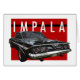 Digital erhöhtes Bild der hinteren 3/4 Ansicht von einem schwarzen Chevrolet Impala 1961 auf einem roten rechteckigen Hintergrund mit dem Wort IMPALA über ihm.