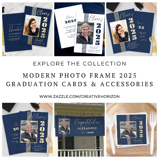 Diese stilvolle Klasse von 2025 Graduierungsparty Einladung hat goldene Streifen, Foto Rahmen und Text auf einem marineblauen Hintergrund.