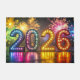 2026, farbenfrohe Neujahrsfeier mit Feuerwerk im Hintergrund.