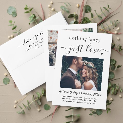 Freuen Sie sich auf einen eleganten Hochzeitsurlaub in diesem stilvollen, modernen Empfang mit einer Einladung von 2 Fotos, die "nichts extravagantes nur Liebe". Alle Formulierungen sind einfach zu personalisieren für jeden Empfang nur Feiern, einschließlich ein Post-Emotion-Party, Verleihfeier, Fortsetzung Hochzeit, 1. Jubiläum, Cocktail-Stunde oder Abendessen Party. Passen Sie es an, um die von Ihnen gewünschten Details wie z. B. Ehedatum, Kleidercode, uAwg, Website usw. einzubinden (IMAGE PLACEMENT TIP: Eine einfache Möglichkeit, ein Foto genau so zu zentrieren, wie Sie es gewollt haben, ist es, es einzuschneiden, bevor Sie es auf die Zazzle-Website hochladen.) Das moderne minimalistische Schwarz-Weiß-Design umfasst zwei Bilder des frisch verheirateten Paares, eine trendige handgeschriebene Schriftzeichen-Kalligraphie und eine schicke Schreibmaschinentypografie. Egal, ob Sie aufgrund der Kokospanidemie entstanden sind oder auf eine kleinere, intimere Minimonie oder Mikrohochzeit reduziert werden, das Glück nach dem Party kann immer noch beginnen. Herzlichen Glückwunsch an die Braut und Bräutigam!