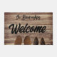 Herzlich willkommen bei Ihren Gästen Cowboystiefel auf rustikalem Holzfußboden. Personalisieren Sie den Text, entfernen Sie jeden Text oder bearbeiten Sie ihn mit dem Designwerkzeug, um einen Schriftart auszuwählen, den Sie bevorzugen. Eine großartige Idee für die Hauswärmung oder Hochzeitsgeschenke. Sie können dieses Design auch, wo es passend ist, zu einem der Produkte hinzufügen, die in der Transfer-Scroll-Bar auf dieser Seite wie das Serviertablett oder die Badematte.