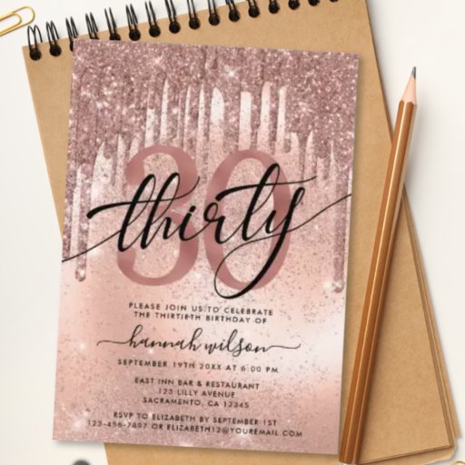 Moderne, trendige Party Einladung aus dem 30. Das Design umfasst Single-Foto, Typografie-Skript, Rose-Gold-Glitzer-Tropfen, Imitat-Folie und funkelnd Glitzer-Hintergrund, Nummer 30 in trendy Rose Goldschrift und Party Details.