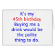 " Es ist mein 45. Geburtstag und kauft mich, den ein Getränk die höfliche Sache sein würde zum zu tun." Humorvoller Entwurf für das 45 Jährige die Lieben, Leute lachen zu lassen und wenn ein freies Getränk aus das Abkommen so sei es herauskommt.