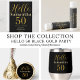 Eine moderne und stilvolle 50. Geburtstagsfeier. Dieses elegante und schicke Design ist in klassischem Schwarz und Gold gehalten. Es ist ein personalisiertes Design, mit dem Text "Hello 50", und Platz Sie Ihren Namen und Party Details hinzufügen. Eine kleinere Version des personalisierten, "Hello 50" Typografie Skriptmotivs wird auf der Rückseite wiederholt, zusammen mit den wichtigsten Party-Details (Name, Alter und Feiertag). Dieses stilvolle Design ist perfekt für eine elegante und unvergessliche 50. Geburtstagsfeier. Fügen Sie zum Personalisieren einfach Ihren Namen, das Datum, den Ort des Party und die UAWG in das Textfeld ein. Um die Farbe oder den Schriftart zu ändern, Karo aus dem Entwurfsbearbeitungsprogramm. Wenn Sie Hilfe bei Personalisierung, passenden Produkten oder für ein individuelles Design benötigen, kontaktieren Sie mich per zazzle Chat oder E-Mail: ursuladawnmoon@gmail.com