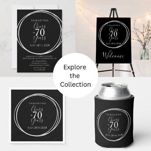 This is a chic and elegant 70th birthday party invitation. This stylish design is in elegant black and silver. It has the message, "Samantha", "Cheers to 70 years" and the celebration date on the front and back. This modern, typography motif is framed by an elegant silver foil effect circle. on the front it also has space for you to add your party and RSVP details. This stylish design is perfect for a chic and unforgettable 70th birthday party or celebration. To personalize, simply add your name, date, party venue and RSVP information in the personalize this text box. To change the color or font, check out the design editing tool. If you need help with personalization, or for a custom design contact me via zazzle chat.