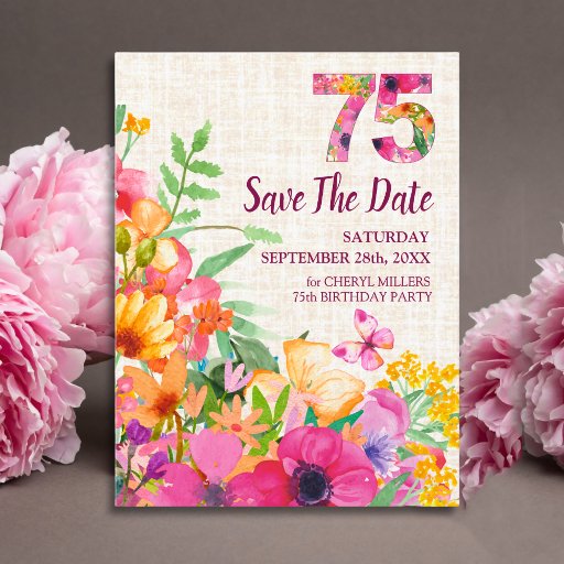 Herzlich willkommen nach einem Meilenstein Geburtstag mit dieser eleganten, blumengeschmückten Postkarte. Mit lebendigen Aquarellfarben-Blume auf einem weichen Leinenuntergrund mit einer kühnen "75" ist dieses individuell gestaltbare Design der perfekte Weg, um Gästen und Lieben zu danken. Viel Spaß!