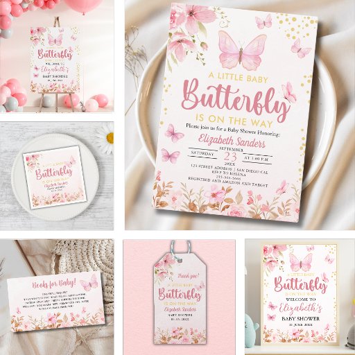 Beautiful design to welcome that little butterfly that is on its way! Surprise your friends and family with this cute design for a girl's baby shower with a Butterfly theme and the phrase "A LITTLE BABY BUTTERFLY IS ON THE WAY" and illustrations of watercolor butterflies flying over pretty flowers in pink tones. The design has all the necessary information for your girl's baby shower. For complementary products, please consult the collection of this cute Butterfly-themed baby shower design.