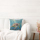 A sea turtle themed pillow with an illustration of a sea turtle under a calm teal sea swimming among the coral on the ocean floor with sun rays beaming down on him through the aqua water. Add a coastal feeling to your beach home!