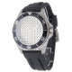 A wristwatch displayed in two views: front with a patterned dial and black bezel, and back showing a metal clasp on a black rubber strap.