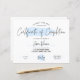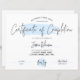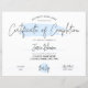Feminine Certificate of Completion mit elegantem, hellblauen Aquarellhintergrund. Perfekt für die Verleihung von Auszeichnungen für berufliche Schönheitskurse. Benutzen Sie es für das Laserzertifikat oder das Salondiplom. Dieses Zertifizierungs-Design mit modernem Script-Schriftart und blauem Aquarelldesign und Platz für Ihre Geschäftsdetails und Ihr Logo. Perfekt, um für Ihre SchülerInnen Abschlusspreise zu erstellen.