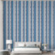 Diseño en color blanco con líneas verticales en tonos azules y brocado abstracto.