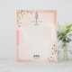Zeichn der Kleiderform mit rosa Pinselstrich und schwarzem Spritzer. Hintergrund ist rosa abstrakt inspiriertes Design mit Punkten oben links und unten rechts.