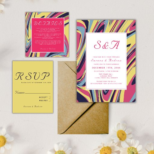 Modernes Design mit farbenprächtigem, kreisförmigen Marmor abstrakte Muster personalisierte Hochzeitseinladung. Rosa gelbe Farbpalette. Diese Karte ist leicht editierbar. Wenn Sie Hilfe bei der Anpassung dieses Produkts benötigen oder mehr passende Produkte für diese Sammlung benötigen, senden Sie mir bitte eine Nachricht über Zazzle.