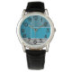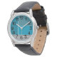 Die Armbanduhr hat eine geometrische Gestaltung eines großen aquamarinen Rechtecks in der oberen links Ecke, dunklere aquamarine Streifen in der oberen rechten Ecke, ein leichteres, aquamarines Rechteck unter den Streifen und schwarze Linien über dem Grund. Wenn Ihnen das Design gefällt, aber andere Farben bevorzugen, dann schreiben Sie mir.