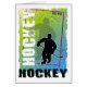Hockeyspieler Silhouette auf blauem und grünem abstraktem Hintergrund. Das Wort Hockey geht auf die Seite.
