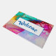 Herzlich willkommen im Hotel mit extravagantem künstlerisch abstraktem Design. Wasserfarbenmalerei mit Farbmischungen und -mischungen, die ein fließendes Marmormuster erzeugen. Ein weißer Rahmen mit einem blauen Rahmen überlagert mit einem Willkommensgeschenk im Inneren.