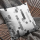 Dieses moderne Kissen zeichnet sich durch ein abstraktes Muster mit kreisförmigen geometrischen Formen in schwarz und grau auf weißem Hintergrund aus.