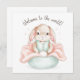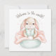 Entdecken Sie diesen charmanten illustrierten Babyhase, eingebettet in eine gemütliche Decke mit der herzlichen Botschaft "Willkommen in der Welt!". Umgeben von sanften Herzen oder Sternen, zeichnet sich dieses Design durch eine sanfte pastellfarbene Farbpalette aus Blau, Minze und Pfirsich aus, die sich perfekt für neugeborene Geschenke oder Babyduschen eignet
