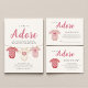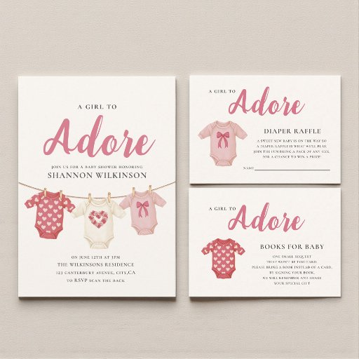 Celebrate the upcoming arrival of a precious baby girl with this "Adore A Girl" baby shower invitation. The design features three darling clothing hanging on a clothesline, each with adorable patterns and colors perfect for a little lady. The soft pink and cream color palette exudes sweetness and charm, making it an ideal choice for a traditional or modern baby shower. This invitation is a beautiful way to invite your loved ones to share in the joy and excitement of your new chapter.