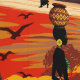 Schöne afrikanische Silhouette mit Wax traditionelles Kleid, mit einer Hand geschmückt Glas, Spaziergang in der Phantastischen Natur der afrikanischen Savanna, auf einem warmen und Friedlichen Sonnenuntergang. Original Vector Illustration Copyright BluedarkArt The ChameleonArt.
