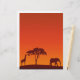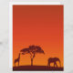 Afrikanischer Safari-Landschaft mit Silhouetten einer Giraffe, einem Baum und einem Elefanten vor dem Sonnenuntergang in Orange- und Rottönen.