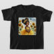 Der T - Shirt ist mit der Aquarellkunst eines niedlichen Schwarzen Mädchens ausgestattet, das in einem Puffsack mit lockig natürlichen Haaren geschmückt ist. Sie ist draußen mit vielen Sonnenblumen, einem Schmetterling und einem Vogel in der Ferne. Sie trägt ein gelbes Tutu-Kleid und eine Blume-Krone im Haar, während sie einen Teddybär mit einem ruhigen Ausdruck hält.