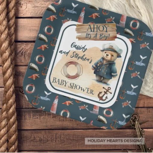 Set segelt mit unserer "Ahoy, It's A Boy" Teddy Bear Einladung und Accessoires Vorlagenkollektion für eine köstliche nautische Babydusche. Dieses charmante Design besticht durch einen Teddy-Bär, der in einer Kapitän-Uniform gekleidet ist und am Sandstrand stehend ist, mit einem hölzernen Schild "Danke!", einem Lebensbewahrer und einem Schiffsanker.