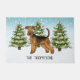 Desteis originelle Cartoon-Illustration einer niedlichen Airedale Terrier Rasse Hund. Der Hund ist in einer Winterlandschaft mit drei grünen Tannenbäumen und fallendem Schnee untergebracht. Der Hintergrund ist ein blaues bis weißes Gefälle, das das Design des kalten Wintertages verleiht. Es gibt auch einen personalisierbaren Textbereich für einen Namen.