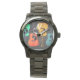 Armbanduhr für einen Gitarrenspieler mit einem Platz für seinen Ersteinstieg. Dunkles Holz sieht Hintergrund mit Gitarren aus grün, orange, gelb und blau über das Gesicht. Fügen Sie in der Vorlage oben einen Vornamen ein. Diese männliche Uhr ist die perfekte Wahl für jeden Musiker oder Musiker. Die Band und der Stil können geändert werden, mit einer großen Auswahl zur Auswahl.
