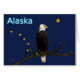 Ein Bald-Adler scannt den Himmel von seiner Terrasse auf einem Baumzweig, überlagert auf einer Fahne von Alaska. Der Text "Alaska" erscheint auch in blau-weiß.
