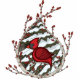 Alexander der Pisley-Kardinal sitzt auf einem Ast, der von hellen roten Beeren umgeben ist, inmitten seiner schneebedeckten Zuhause. Seine Krimsonfedern heben sich von dem schneebedeckten immergrünen hinter ihm ab und schaffen eine perfekte Szene für Weihnachten oder andere Winterferien.