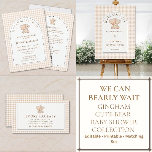 Host a sweet and memorable celebration with this We Can Bearly Wait baby shower invitation, featuring a soft beige gingham background, adorable teddy bear illustration, and elegant arched design. The coordinated back includes space for diaper raffle, books for baby, and registry details, making it both stylish and practical. Perfect for gender-neutral, minimalist, modern, and neutral baby shower themes. Fully customizable for your special event.