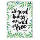 Alle guten Dinge sind wild und frei. Eine schöne Grußkarte zeigt das Zitat von Thoreau in knackigem, schwarzem Pinselstrich, umgeben von dschungelgrünen botanischen Blätter in Aquarell. Bleiben Sie für Ihre Nachricht drinnen.