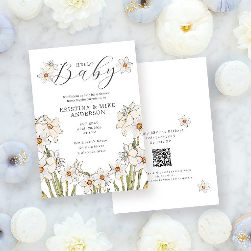 Say "Hello Baby" mit sonnigen Frühlingsduschen All-in-One-Babydusche mit einem Design von Vintagen Narzissen | Erzählungen Framing sorgfältig ausgewählten Text. Auf der Rückseite befinden sich die Babydusche-Details sowie QR-Code für die Mutter-zu-sein-Registrierung. Mit diesem süßen Design personalisieren Sie einfach das Skript für Ihre Bedürfnisse.