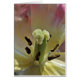 Inside inscription (kann modifiziert oder gelöscht werden): "Bee.. Du weißt nie, wer vielleicht vorbeifliegt!" Umgeben von Pollengehärten, sind die Stigma (Pollenrezeptoren) einer Papagei-Tulpe bereit, Pollen vom nächsten Insekt zu erhalten.