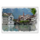 Bergdörfsszene mit Bergen im Hintergrund und Enten am See im Vordergrund.