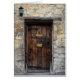 Grußkarte mit einer alten hölzernen Haustür in einer Steinfassade eines Hauses mit einem Licht über dem Eingang.