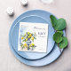 Amalfi Positano Vietri blau Majolica Fliesen Zitronen Sommer Babydusche Windel Tombola Umschließkarte, mediterrane thematisch blau und gelb Fliesen mit einem Haufen Zitrusfrüchte mit Zitronen und Blüten in blauen Keramiken Vase geschlechtsneutrale Babydusche Tombolekarte Karte