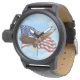 Männerkronenschützer mit schwarzer Lederrippenuhr mit Bild einer schwingenden amerikanischen Flagge und einem kahlen Adler in Flug auf einem wolkig blauen Himmel. Siehe dazu passende quadratische Taste, Acryl-Fotoskulptur-Button, quadratischer Charme, großer quadratischer Premiummetall-Schlüsselanhänger, viereckiger doppelseitiger Acryl-Schlüsselanhänger und Acryl-Fotoskulptur-Schlüsselanhänger. Sehen Sie sich die gesamte Sammlung von Independence Day Watch unter der Rubrik ACCESSORIES im Bereich HOLIDAYS an.