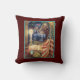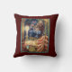 Patriotic Christmas throw pillow with a view of the Nativity scene in a stained-glass Church window and the American Flag draped over the Bible down in front of the window.