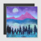 Eine abstrakte Landschaft mit einzigartigen Farben und Texturen, die eine Bergszene mit Bäumen und unangenehmen Nebel in lila, blauen, aquamarinen und zyanfarbenen Tönen zeigt.