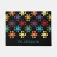 Herzlich willkommen auf Ihrer Zuhause mit dieser personalisierten Tür. Diese Begrüßungstafel oder Türmatte ist gemustert, wie ein Amish-Quilt mit einem Ohio Star-Quilt-Blockdruck in Rot, lila, Blau, Gelb, Gold, Orange und Grün-Set vor schwarzem Hintergrund auszusehen. Es ist bereit, mit einem Namen oder einem anderen Text in hellblauer Schrift personalisiert zu sein.