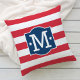 Das patriotische Kissendesign zeichnet sich durch einen dekorativen Rahmen aus, der mit einem eigenen Monogramm aus der Familie, Sternakzenten und horizontalen Streifen versehen ist. Rot, Weiß und Marineblau.