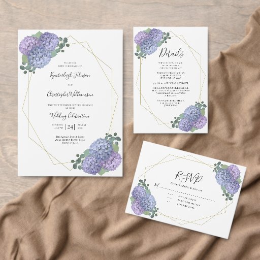 Dieses wunderschöne, elegante boho-Design besticht durch Aquarellbouquets von Hydrangea-Blume in staubblauen, hellen Perwinkeln, Lila und Lavendel lila, sowie Eukalyptus-Blätter und einen trendigen goldenen geometrischen Rahmen. Im Rahmen befindet sich der individuell anpassbare Text für Ihre besondere Veranstaltung in beliebter Typografie. Die Rückseite der Karte weist einen pastellfarbenen, staubblauen Hintergrund auf. Sie können dieses Element personalisieren, indem Sie den Text in der Vorlage ändern.